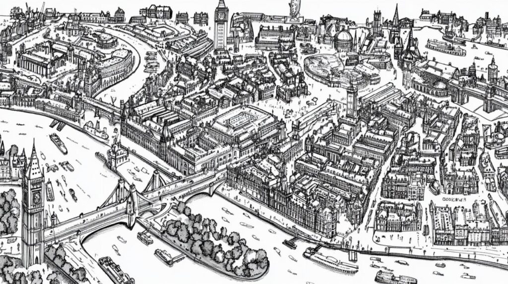Le fleuve qui traverse la capitale britannique constitue naturellement l'élément central de toute représentation cartographique de Londres. En noir et blanc, la Tamise devient une ligne serpentine élégante qui structure l'ensemble de la composition. Ses méandres offrent un repère visuel immédiat et permettent de situer mentalement les quartiers emblématiques de la ville. Les monuments historiques, lorsqu'ils sont signalés sur ces plans, bénéficient également de cette mise en valeur graphique. Le contraste accentue leur importance symbolique et guide naturellement le regard vers ces points d'intérêt culturel, créant une lecture à plusieurs niveaux de la carte.